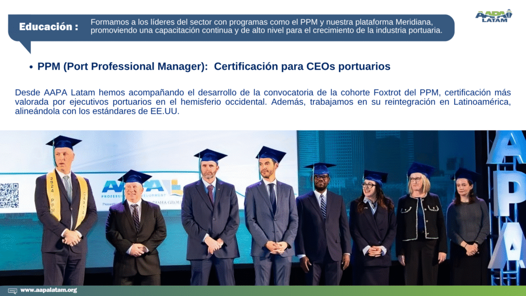 Desde AAPA LATAM acompañamos el desarrollo de la cohorte Foxtrot del PPM, la certificación portuaria más prestigiosa del hemisferio, y trabajamos en su reintegración en la región bajo estándares alineados con EE. UU. Esto permite elevar las capacidades directivas con formación homologada, unificar competencias y buenas prácticas entre puertos, mejorar la movilidad profesional, impulsar el benchmarking operativo y de sostenibilidad y, en conjunto, fortalecer la competitividad de los sistemas portuarios latinoamericanos frente a los grandes mercados globales.